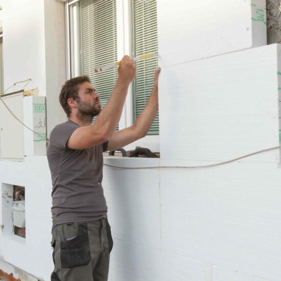 - Fixez d’abord une couche d’isolant (comme le polystyrène expansé ou la laine de roche) sur les murs extérieurs de votre bâtiment ;